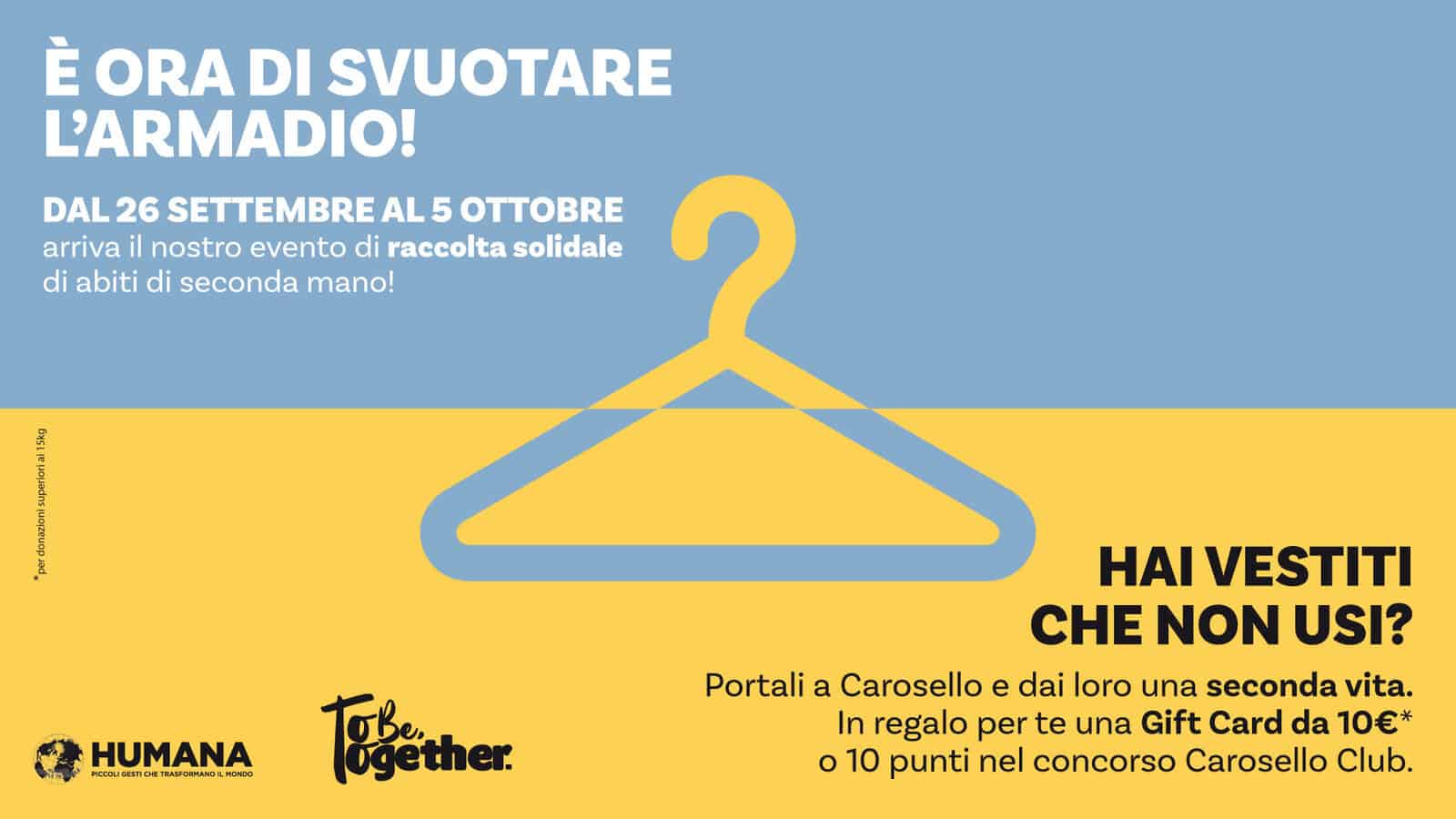 Dal 26 settembre al 5 ottobre a Carosello puoi fare la differenza con un gesto semplice! Porta i tuoi abiti usati alla postazione Humana in galleria, e dai vita ai tuoi capi contribuendo a un progetto solidale, ricevendo in cambio punti per il concorso Carosello Club o Gift Card.