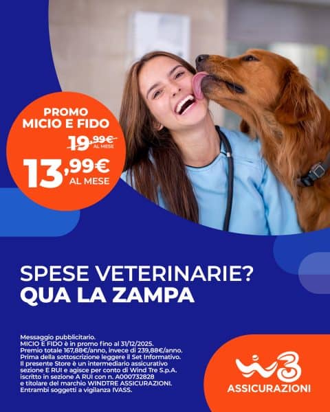 C’è una sorpresa per te! La polizza MICIO E FIDO è in promo per un periodo limitato. Approfittane per proteggere la salute del tuo animale domestico e tutelarti da spese veterinarie improvvise in caso di malattia o infortunio. Sottoscrivila prima che il tuo animale domestico compia 10 anni e potrai rinnovarla senza limiti di età. WINDTRE ASSICURAZIONI, la tua nuova agenzia, semplifica il modo di assicurarti.